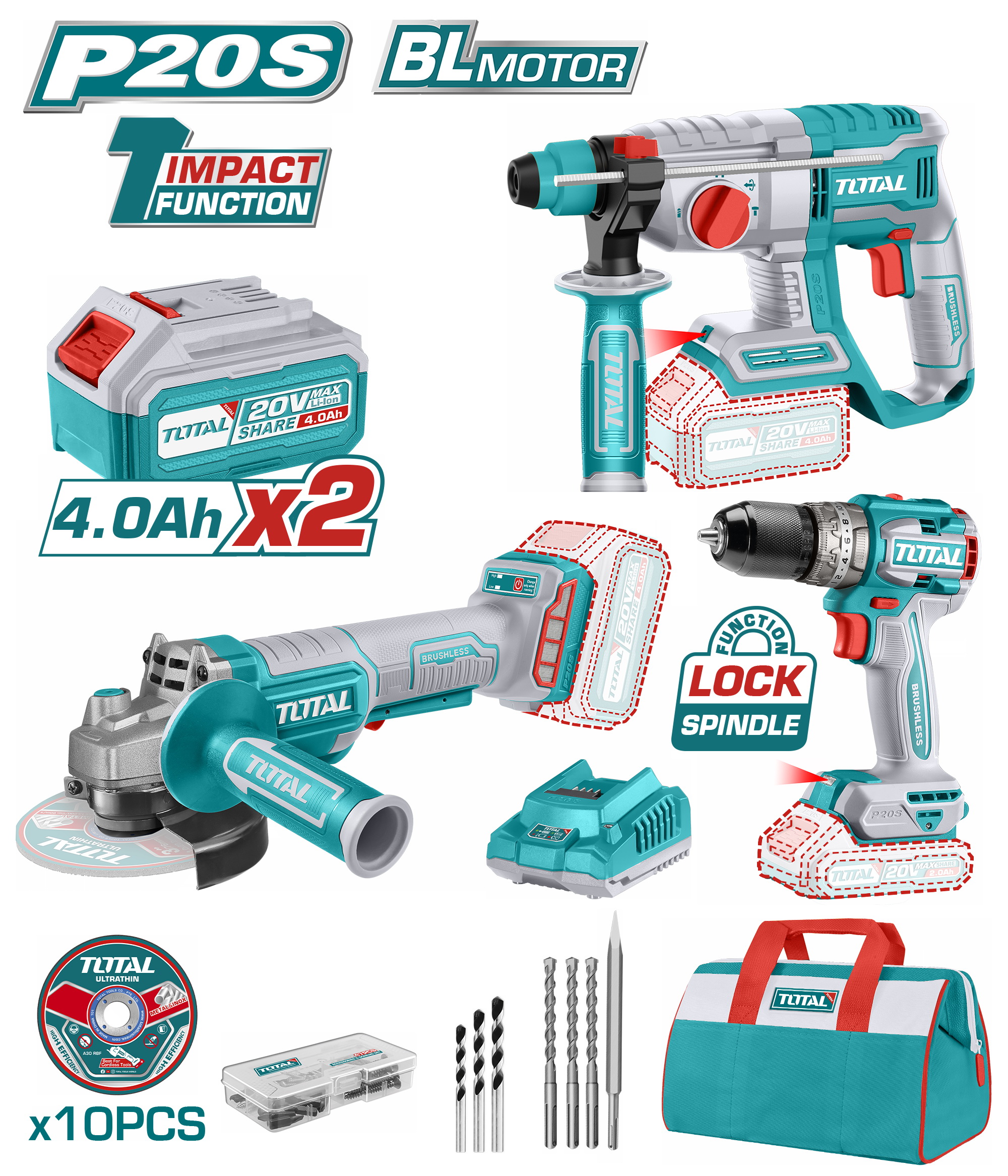 TOTAL ΕΠΑΓΓΕΛΜΑΤΙΚΟ ΣΕΤ ΔΡΑΠΑΝΟΚΑΤΣΑΒΙΔΟ + ΠΑΛΜΙΚΟ ΚΑΤΣΑΒΙΔΙ + ΣΕΓΑ + ΔΙΣΚΟΠΡΙΟΝΟ ΜΠΑΤΑΡΙΑΣ ΛΙΘΙΟΥ 20V / 4Ah (TCKLI2010)
